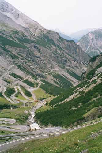 | Als wir aufstehen, beginnt sich ein Zwischenhoch durchzusetzen, die Sonne zeigt sich. Die Motorradkleidung hat über Nacht ihr trockenes Stadium beinahe wieder erreicht. Nach einem Rundgang durch den Ort besteigen wir die Motorräder und fahren das kurze Stück bis Mals, dann talabwärts nach Spondinig, um hier nach rechts auf den Stelvio abzubiegen. Die Wolken verziehen sich mehr und mehr, es wird sogar richtig warm. Gestern hat uns der Regen behindert, heute sind es Radfahrer. Ein Radrennen findet am Stilfser Joch statt. Schon in Glurns regelten Carabinieri den Verkehr, um die Radfahrergruppen zu lotsen. Wir bewegen uns auf das Ortlermassiv zu, dessen Gipfel zu sehen sind. Hinter dem Ort Prato allo Stelvio führt die Strasse auf langgezogenen Kurven in den Wald, um schliesslich hinter dem Dorf Trafoi in engen Serpentinen auf das Stilfser Joch anzusteigen. Eine Besonderheit dieses Passes ist, dass die einzelnen Kehren, die wir meistern müssen, durchnumeriert sind, insgesamt 48 an der Zahl. Nach einem ewigen Gekurbele durch herrlichen Wald auf einer schmalen und holperigen Strasse erreicht man die Baumgrenze und befindet sich doch erst an Tornante (Kehre) 27 bis zur Passhöhe. |