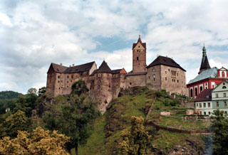 | Die Strasse aus Eger hinaus verläuft anfangs schnurgerade nordostwärts. Wir fahren durch hügeliges und teilweise bewaldetes Gelände, Landwirtschaft dominiert die Szene. An Sokolov vorbei führt die Route. Kurz vor Karslbad sehe ich einen Abzweig Richtung Loket, einem Tipp von Elischka. Die Böhmische Königsburg Loket (Ellbogen) wurde im 12. Jh. als Trutzburg zum Schutz der Grenze errichtet, sie wurde damals als Schlüssel zum Königreich Böhmen bezeichnet. Also abgebogen und nach ca. 10Km auf einer schmalen Landstrasse stehen wir unvermittelt vor einer steil aufragenden Burg, die auf einem Felsen thront. Über die Eger, die unseren Weg begleitet hat und hier einen Mäander bildet (daher wohl der Name), führt eine alte Steinbrücke und schon fahren wir auf den Marktplatz des Örtchens unter der Burg. Auch hier, wie schon in Cheb, sehen wir nur liebevoll restaurierte und reich verzierte Fassaden. Inmitten des Dorfes steht ein schöner Brunnen, um den herum sich Menschen aller Altersstufen versammelt haben, die uns neugierig und distanziert mustern. Wie häufig in Tschechien ist auch hier der innerörtliche Strassenbelag aus Pflastersteinen bestehend. Wir rumpeln zu einem Parkplatz und geniessen ein paar Minuten diesen beschaulichen Ort. | ![]() Loket: Gewaltige Burganlage oberhalb.... |